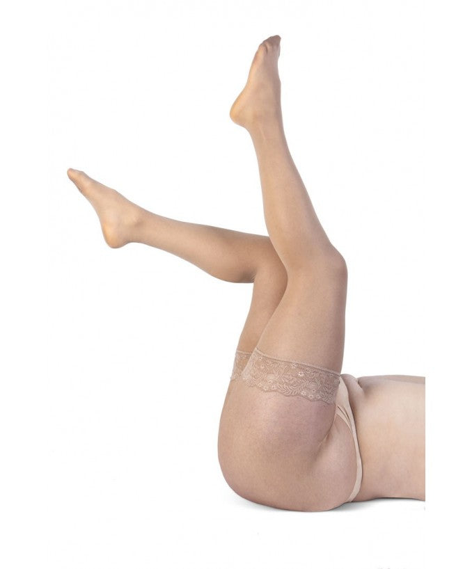 Les bas autofixants à volants bas 30 deniers Leela allient élégance, confort et coupe parfaite.